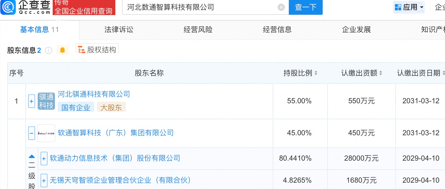 企查查APP显示,近日,河北数通智算科技有限公司成立,法定代表人为曹伟,注册资本1000万人民币,经营范围包括数据处理和存储支持服务、人工智能公共数据平台、云计算装备技术服务等。企查查股权穿透显示,该公司由河北骐通科技有限公司、软通动力(301236.SZ)旗下软通智算科技(广东)集团有限公司共同持股。