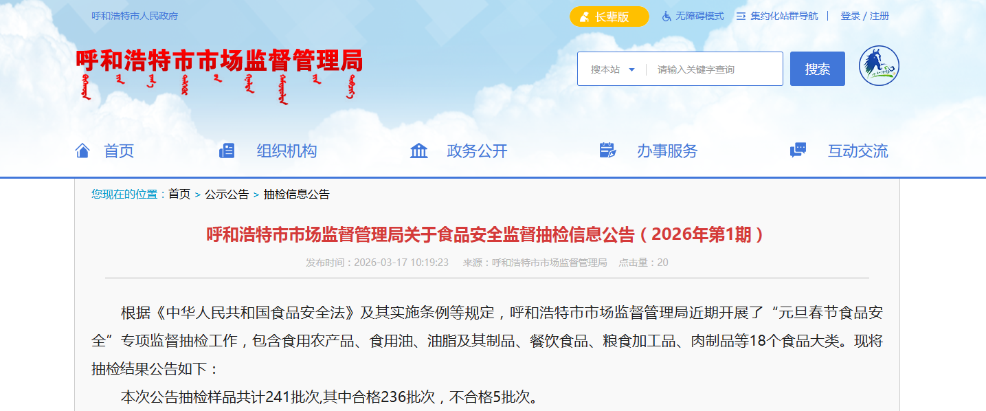 根据《中华人民共和国食品安全法》及其实施条例等规定,呼和浩特市市场监督管理局近期开展了“元旦春节食品安全”专项监督抽检工作,包含食用农产品、食用油、油脂及其制品、餐饮食品、粮食加工品、肉制品等18个食品大类。现将抽检结果公告如下: