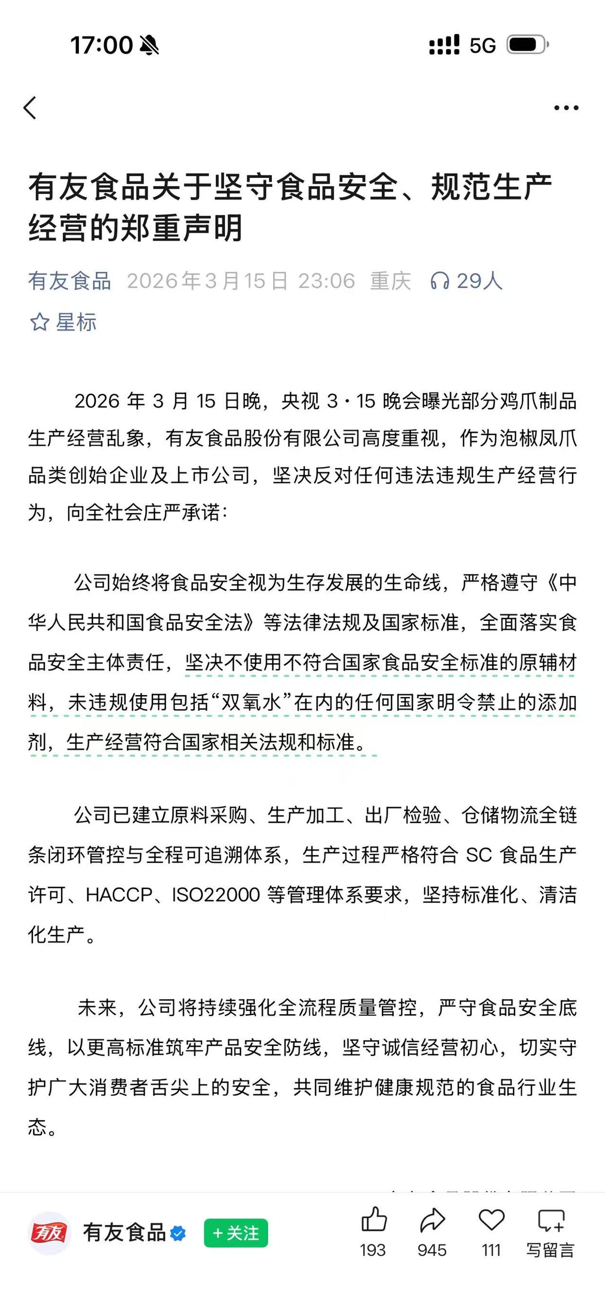 顶端新闻记者查询发现,在3·15晚会结束后不久,包括有友、辣媳妇等在内的多家泡椒凤爪头部企业,几乎同步在其官方公众号及社交平台发布了紧急声明。