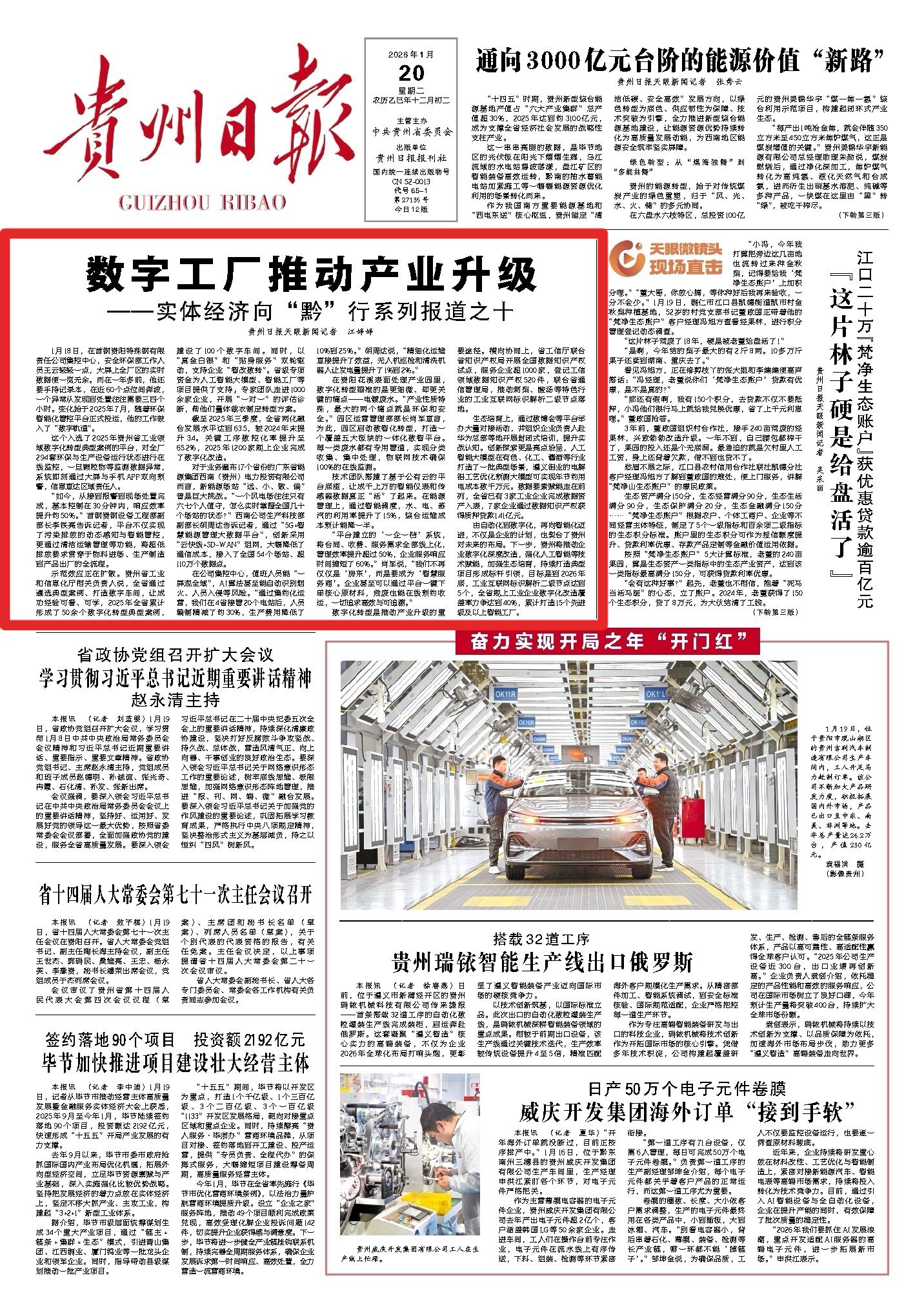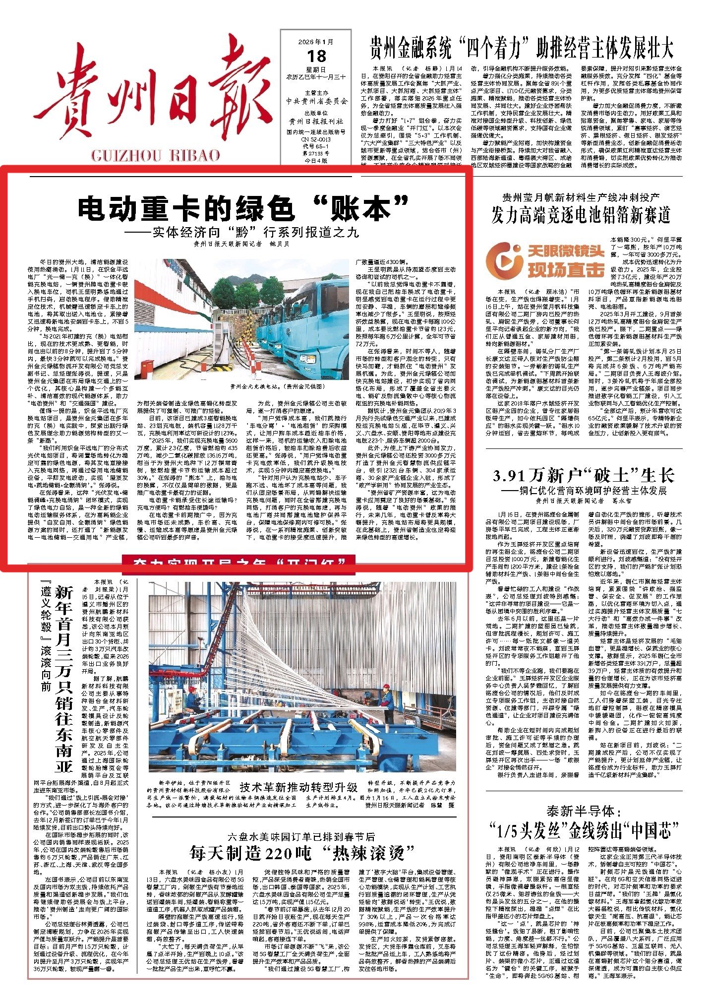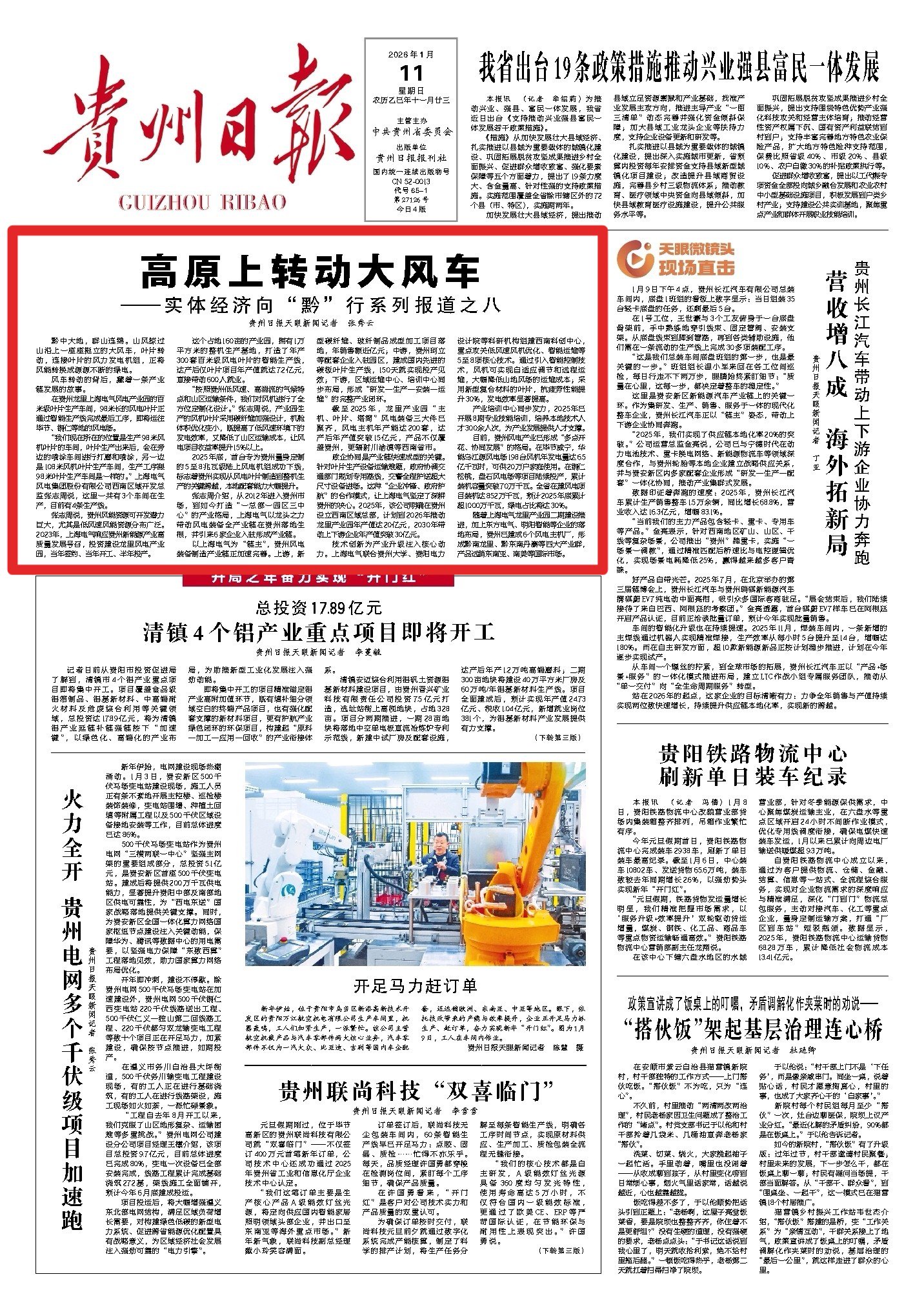 《“链”式投资拼出产业新版图》报道聚焦轻纺、铝加工等领域,通过毕节宏盛纺织、六盘水铝产业集群的实践,展现“链式投资”的集群效应,让毕节轻纺产业年产值同比增长50.33%;《开阳磷产业的“顶梁柱”蝶变》深挖磷矿资源禀赋,以绿色化、精细化改造推动资源优势向产业优势转化,印证“富矿精开”的深刻内涵;《贵州制造以“智变”创“质变”》以盘江民爆智慧工厂为典型,用“人机隔离”生产等创新成果,印证全省关键工序数控化率达65.2%的成效;《大风车转出一条产业链》聚焦风电产业,展现从设备制造到电力输送的全链条发展,成为新能源产业崛起的生动注脚。