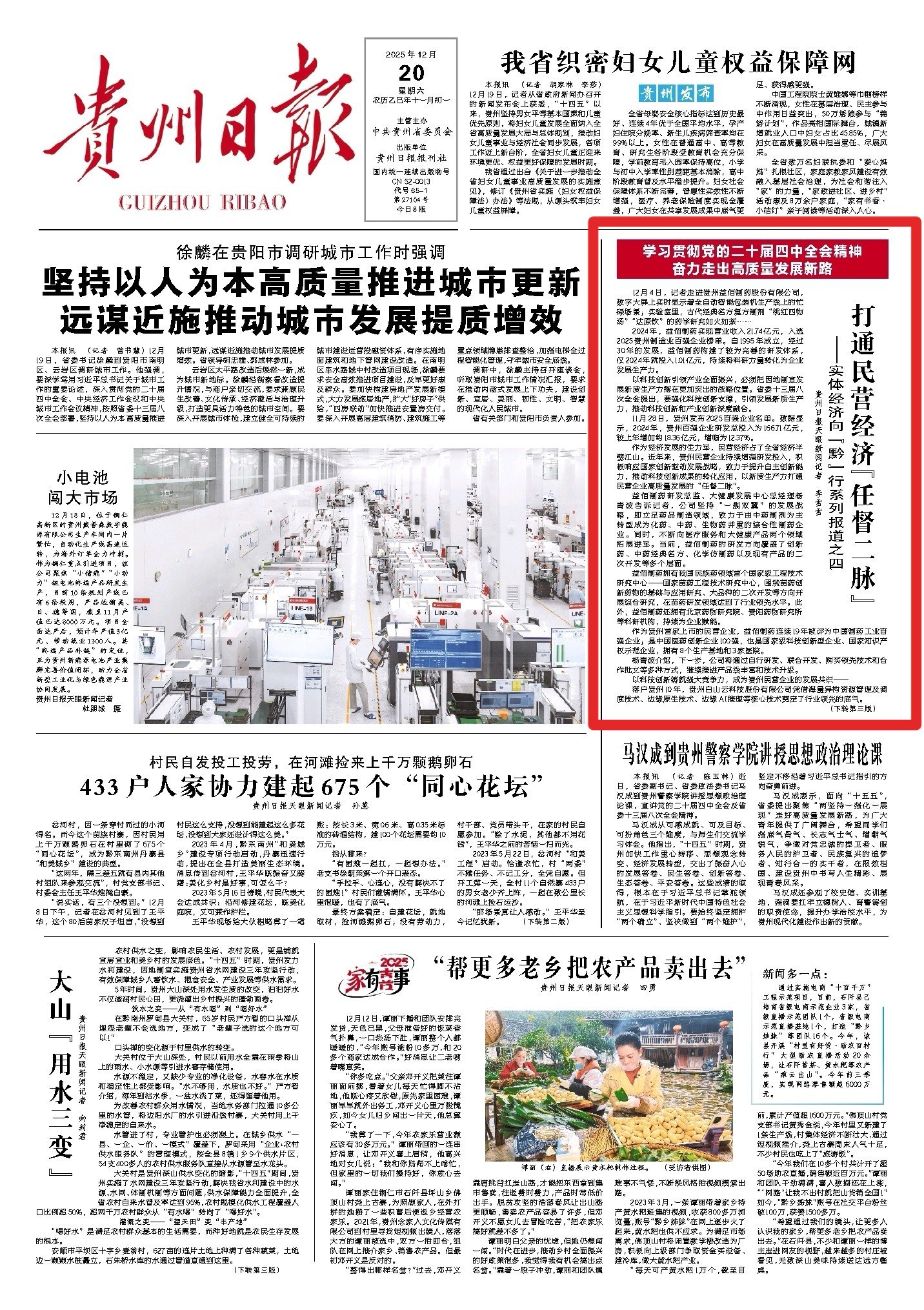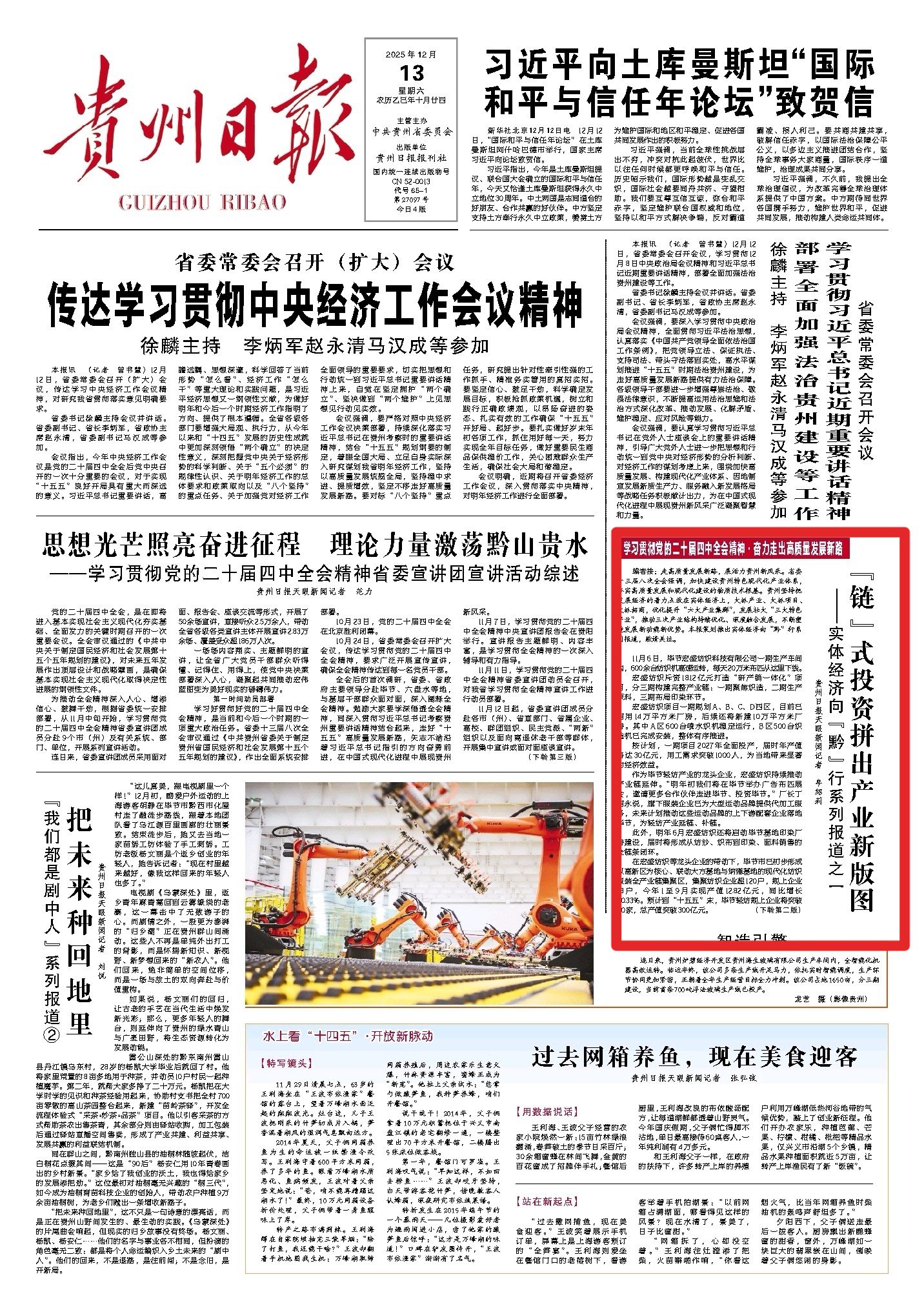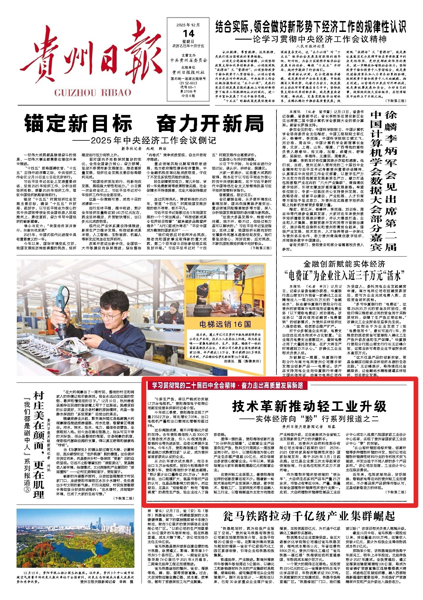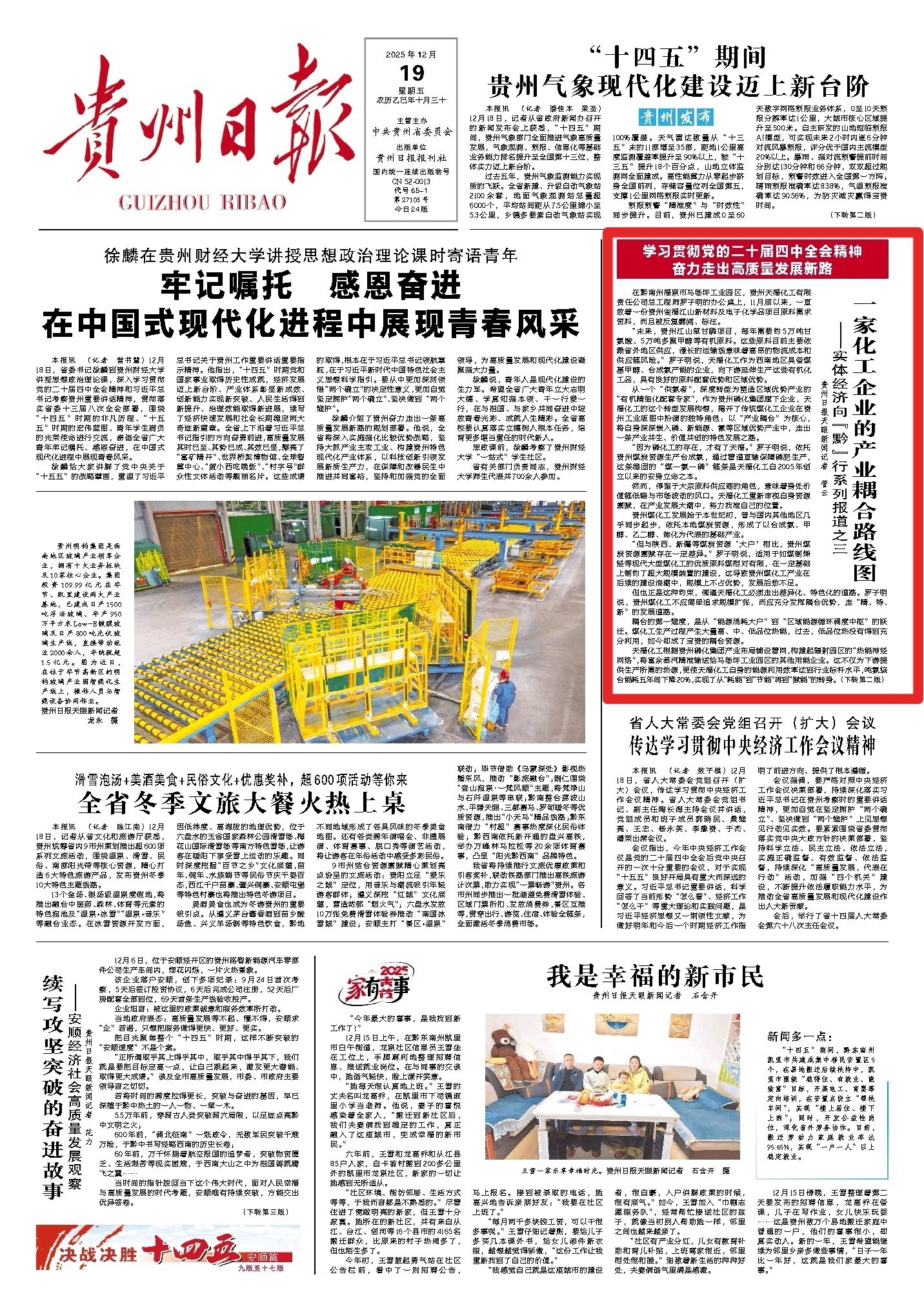 《“链”式投资拼出产业新版图》报道聚焦轻纺、铝加工等领域,通过毕节宏盛纺织、六盘水铝产业集群的实践,展现“链式投资”的集群效应,让毕节轻纺产业年产值同比增长50.33%;《开阳磷产业的“顶梁柱”蝶变》深挖磷矿资源禀赋,以绿色化、精细化改造推动资源优势向产业优势转化,印证“富矿精开”的深刻内涵;《贵州制造以“智变”创“质变”》以盘江民爆智慧工厂为典型,用“人机隔离”生产等创新成果,印证全省关键工序数控化率达65.2%的成效;《大风车转出一条产业链》聚焦风电产业,展现从设备制造到电力输送的全链条发展,成为新能源产业崛起的生动注脚。