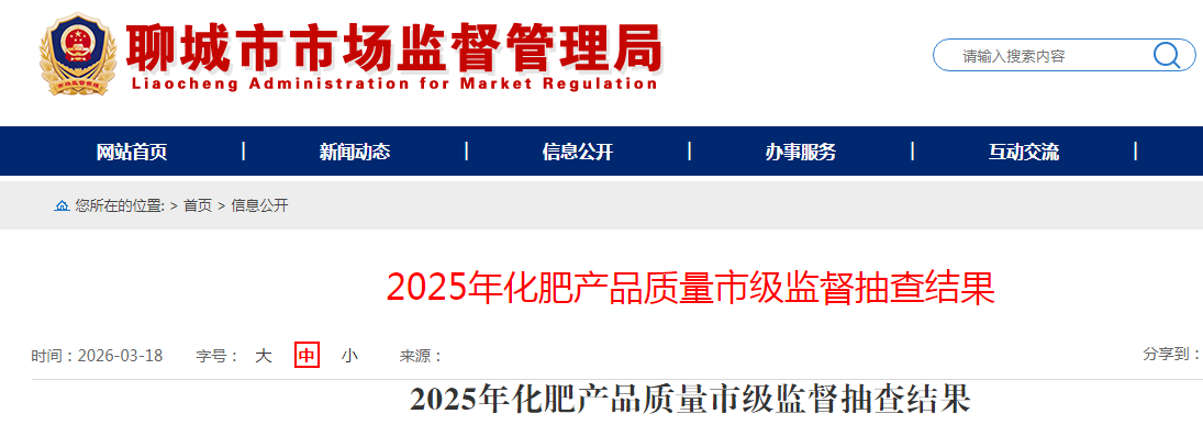中国质量新闻网讯 据山东省聊城市市场监督管理局网站消息,近日,聊城市市场监督管理局公布2025年化肥产品质量市级监督抽查结果。本次共抽查生产领域及流通领域化肥产品70批次。