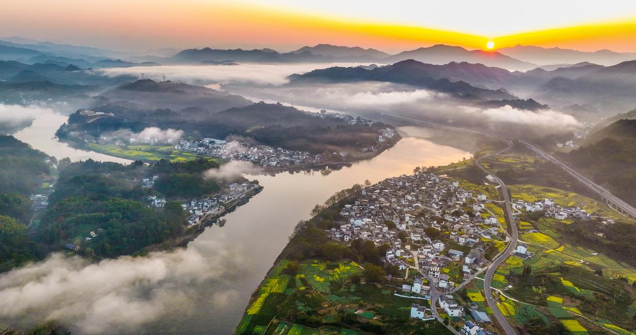 3月15日在安徽省黄山市歙县雄村拍摄的新安江沿岸风景(无人机照片)。