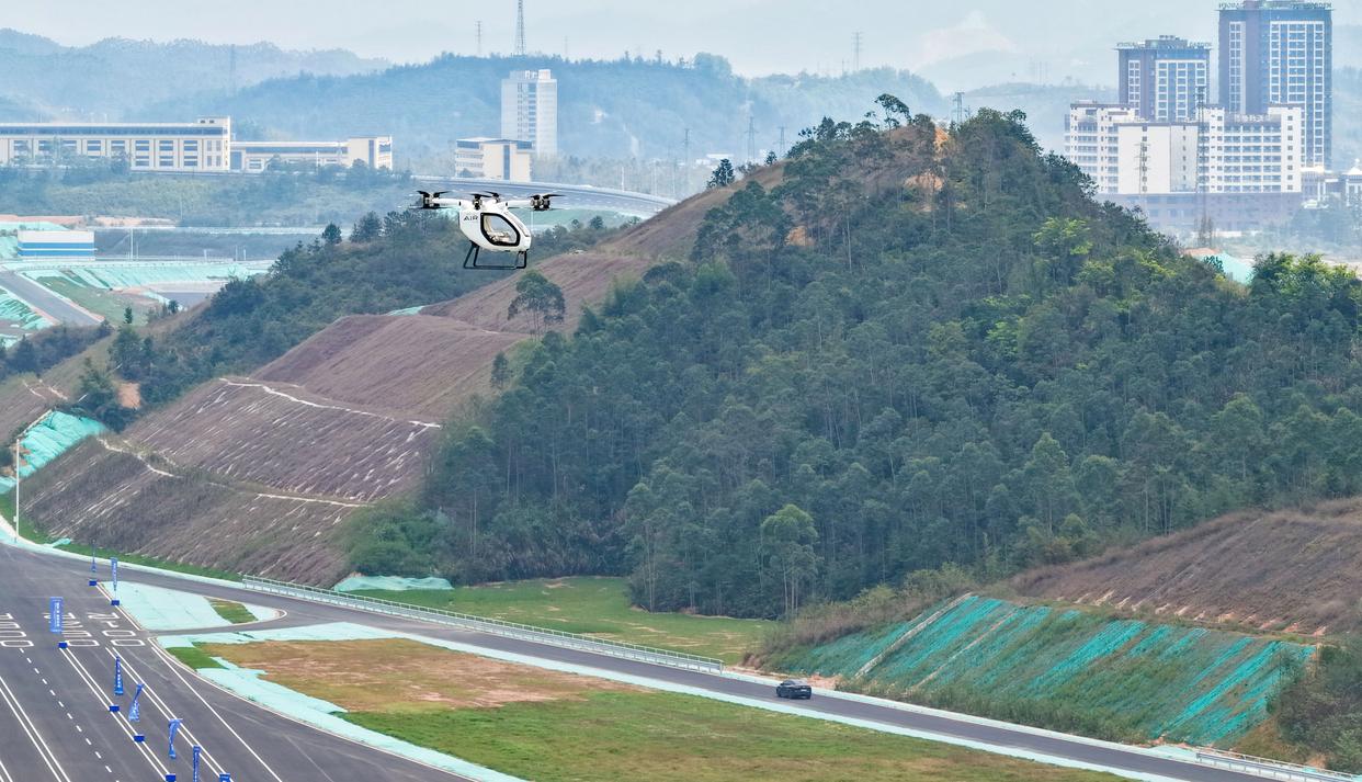 3月20日,广汽飞行汽车和车辆在中国汽研南方试验场同步测试(无人机照片)。