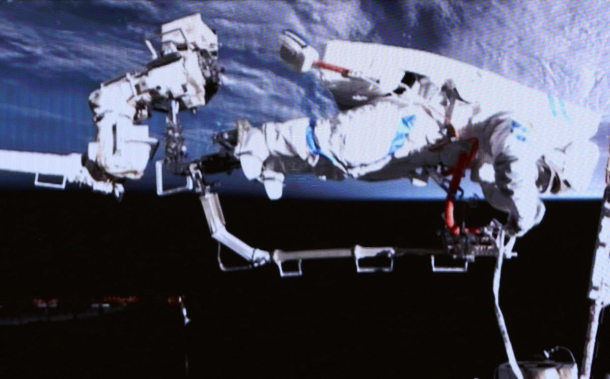 3月16日19时35分,经过7小时的出舱活动,神舟二十一号乘组航天员张陆、武飞、张洪章密切协同,在空间站机械臂和地面科研人员的配合支持下,圆满完成空间碎片防护装置安装等任务。出舱航天员张陆、武飞已安全返回问天实验舱,出舱活动取得圆满成功。
