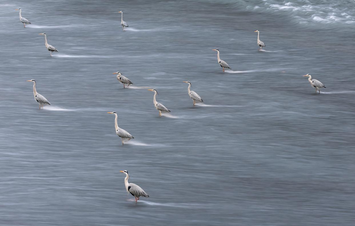 3月17日,一群鹭鸟在成都锦江河道中迎着逆流“站桩”觅食。
