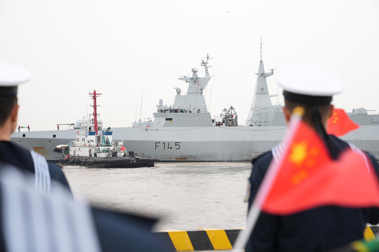3月20日,南非海军“阿玛托拉”号护卫舰结束访问离开上海,中国海军官兵在码头欢送。