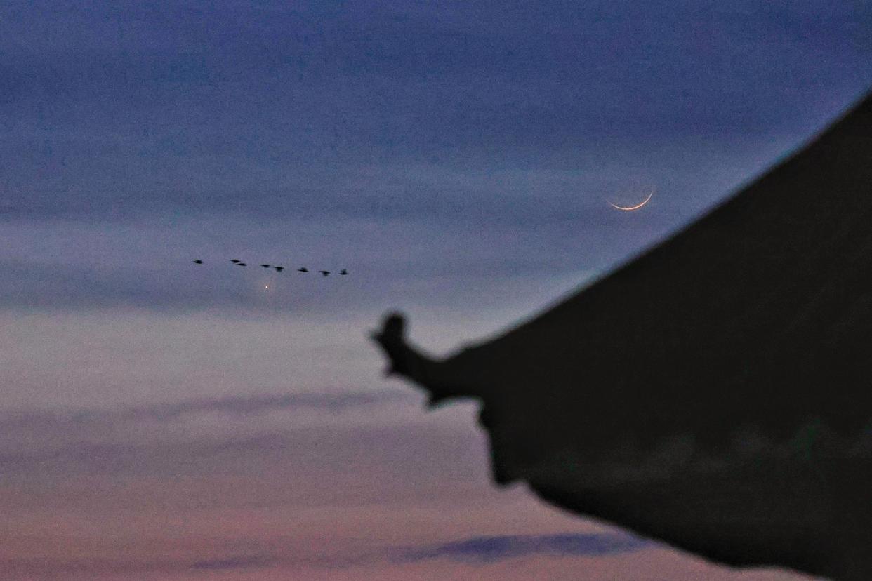 3月20日在黑龙江省同江市拍摄的“长庚伴月”。