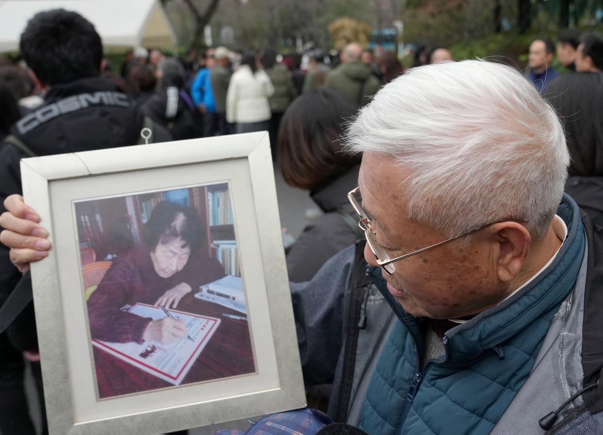 3月18日,一名市民捧着于漪老师的照片前来送别。