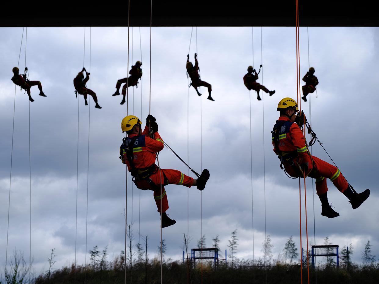 3月17日,新入职消防员在进行绳索训练。