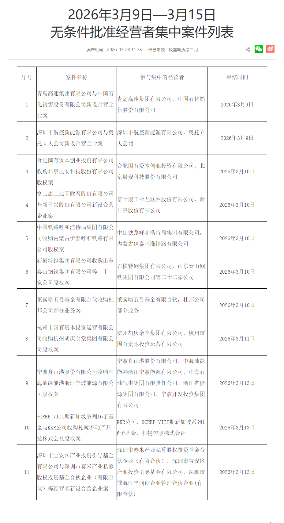 3月23日,国家市场监管总局反垄断执法二司发布《2026年3月9日—3月15日无条件批准经营者集中案件列表》,其中包括富士康工业互联网股份有限公司与新日兴股份有限公司新设合营企业案。
