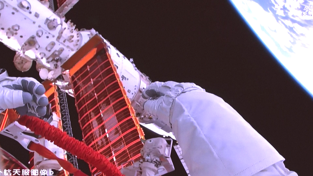 (视频截图)3月16日19时35分,经过7小时的出舱活动,神舟二十一号乘组航天员张陆、武飞、张洪章密切协同,在空间站机械臂和地面科研人员的配合支持下,圆满完成空间碎片防护装置安装等任务。 中国载人航天工程办公室 图