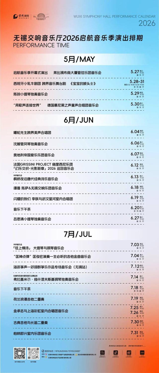 未来的66天,音乐厅将推出近40场演出和十余场公益文化活动,为锡城观众呈现涵盖交响乐、独奏音乐会、声乐合唱、室内乐及跨界音乐舞台等多类艺术形式的精彩演出。