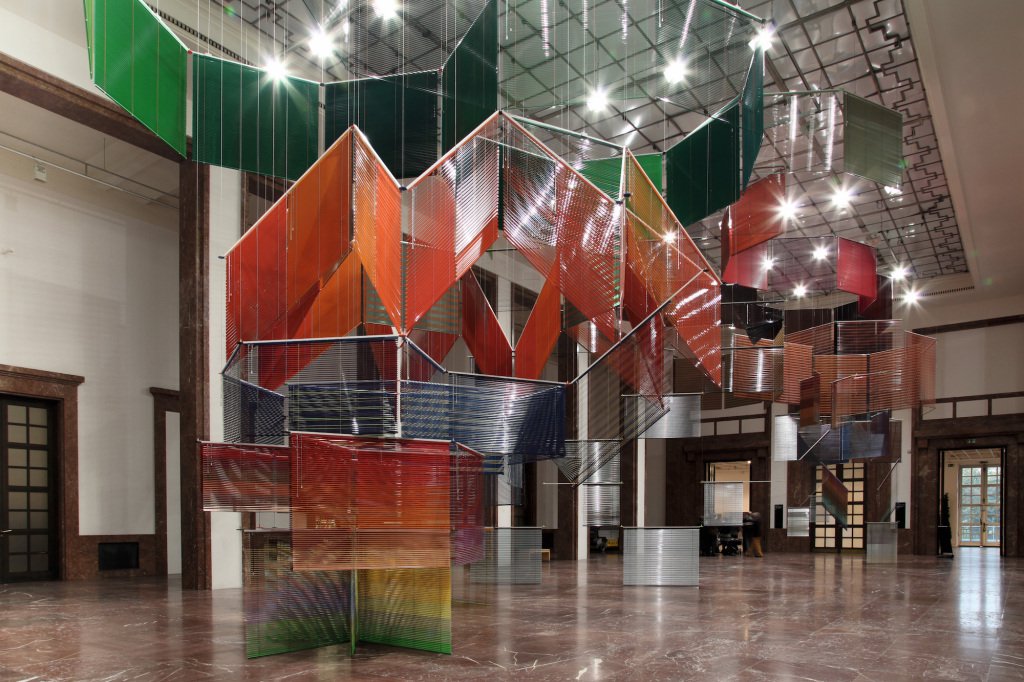 梁慧圭,《接纳史诗的离散——论非宣泄性离散体积》,2012年,铝制百叶窗,粉末涂层铝悬挂结构,钢丝绳,954×969×2569厘米,“致公众——艺术之家之友”展览现场,慕尼黑,艺术之家,德国,2012年。摄影:延斯·韦伯。艺术家惠允。