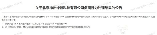 2025年8月9日,中国移动采购与招标网发布关于北京神州绿盟科技有限公司负面行为处理结果的公告。公告显示,该公司在中移物联网有限公司采购项目中存在违反《中移物联网有限公司供应商负面行为管理实施细则》的情况。