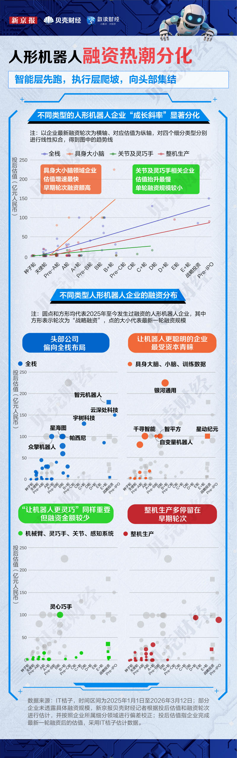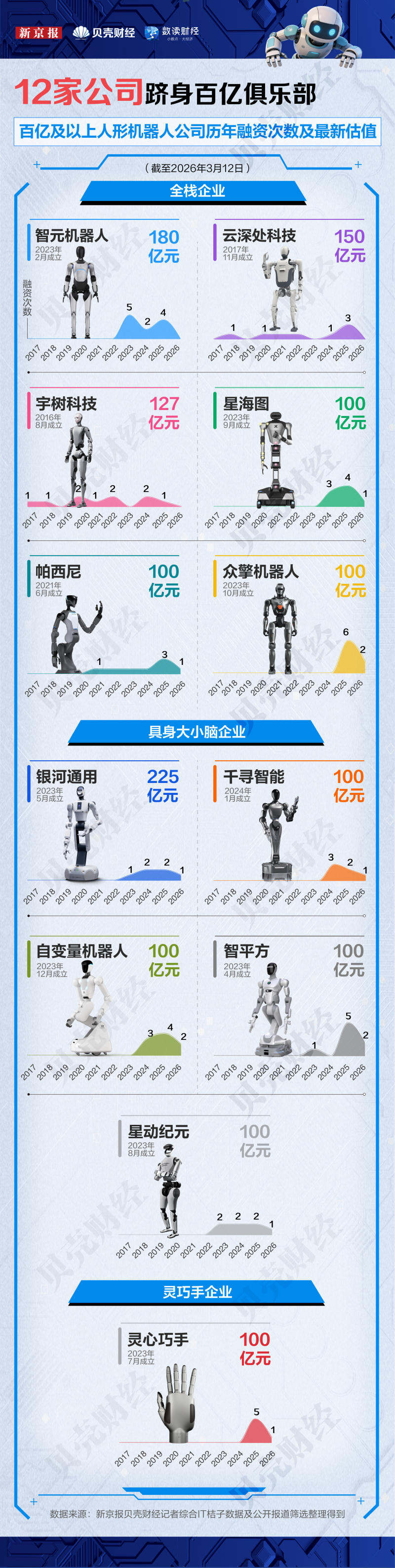 新京报贝壳财经记者根据IT桔子数据及公开资料梳理发现,当前已有12家人形机器人企业跨过百亿估值门槛,其中6家完成了全栈布局,5家从具身大小脑的自主研发竞争中脱颖而出。以银河通用为例,在2026年春晚展示自主决策能力、开年完成最新一轮融资后,估值已达225亿元。