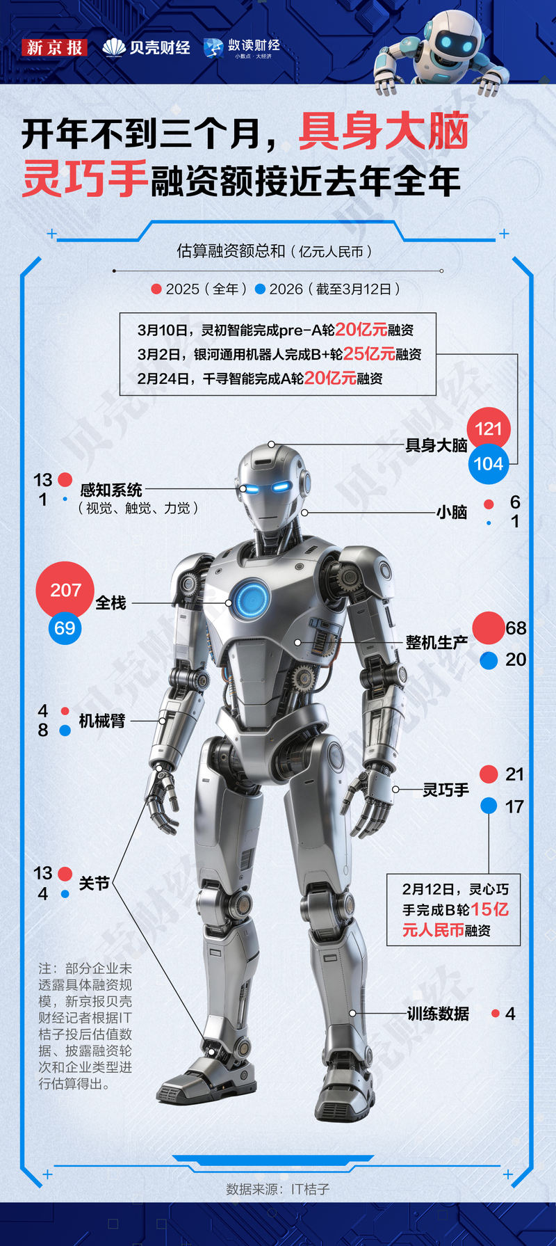2026年开年,融资更多流向人形机器人行业的关键卡点。新京报贝壳财经记者梳理发现,年内该赛道超半数的投资,涌向了决定机器人“智商”与“动手能力”的两大细分领域——具身大脑与灵巧手。