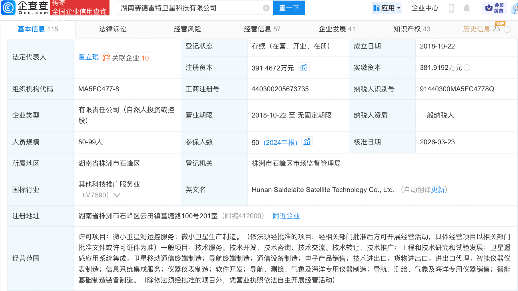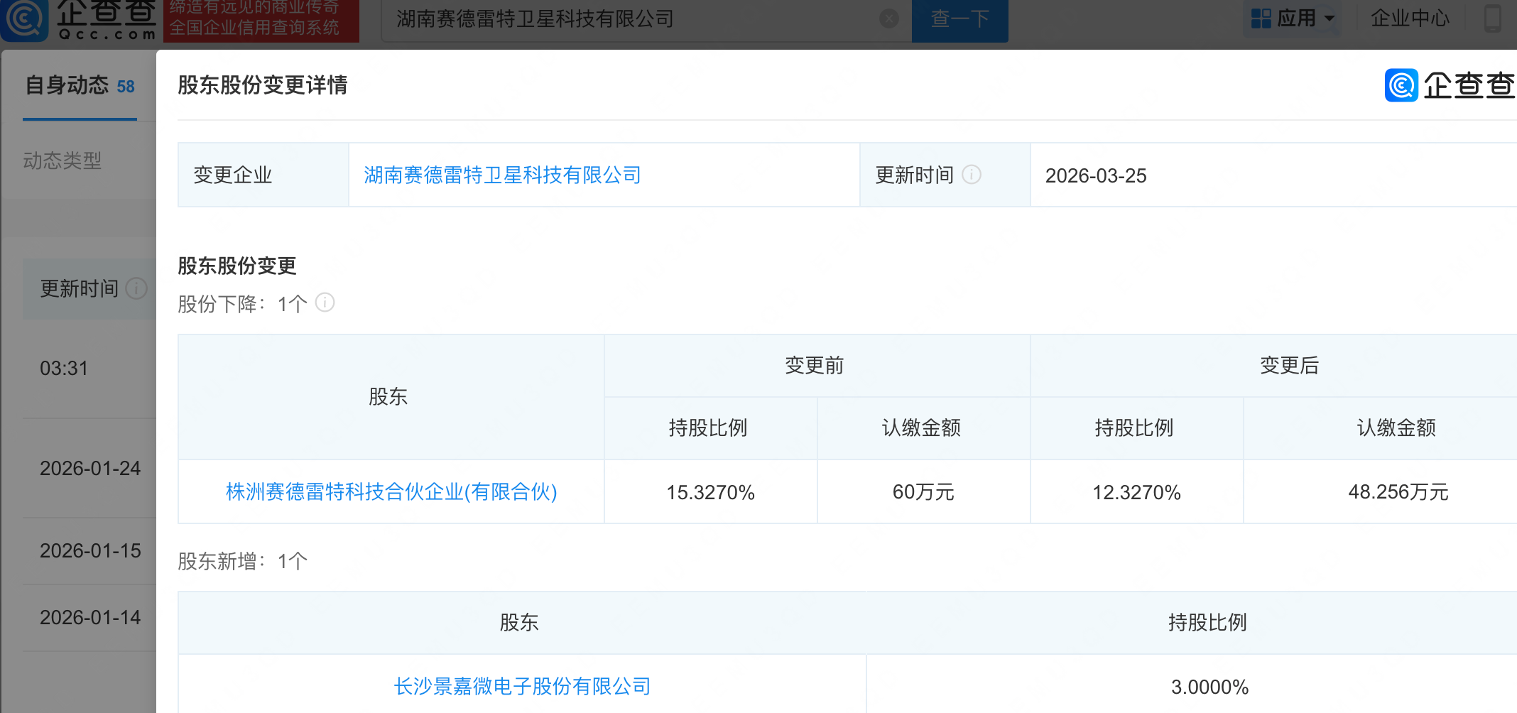 企查查APP显示,近日,湖南赛德雷特卫星科技有限公司发生工商变更,新增景嘉微(300474.SZ)为股东。企查查信息显示,该公司成立于2018年,注册资本391.47万元,经营范围包含:微小卫星测运控服务;微小卫星生产制造;卫星遥感应用系统集成;卫星移动通信终端制造等。