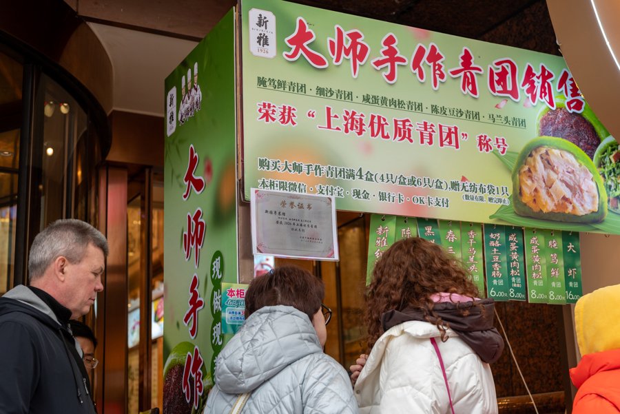 就连海外游客也纷纷加入青团追鲜大军,让这道中式传统点心收获国际粉丝。新民晚报记者在南京路上的新雅门店看到,一组来自俄罗斯的三口之家游客,在门店前驻足端详产品招牌,仔细了解后便选购了两枚青团。拿到热气腾腾的青团后,一家三口迫不及待地现场品尝。
