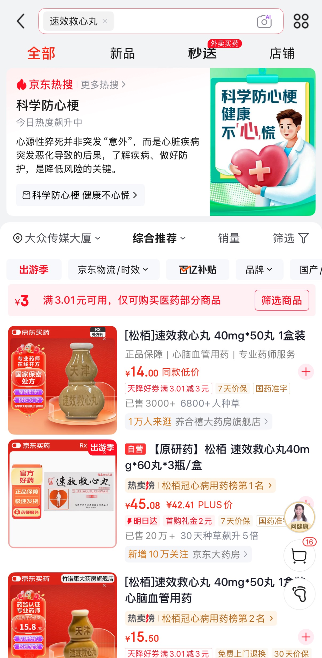 记者在京东页面搜索“速效救心丸”,顶端是一条京东热搜:科学防心梗,其中提到了心源性猝死。