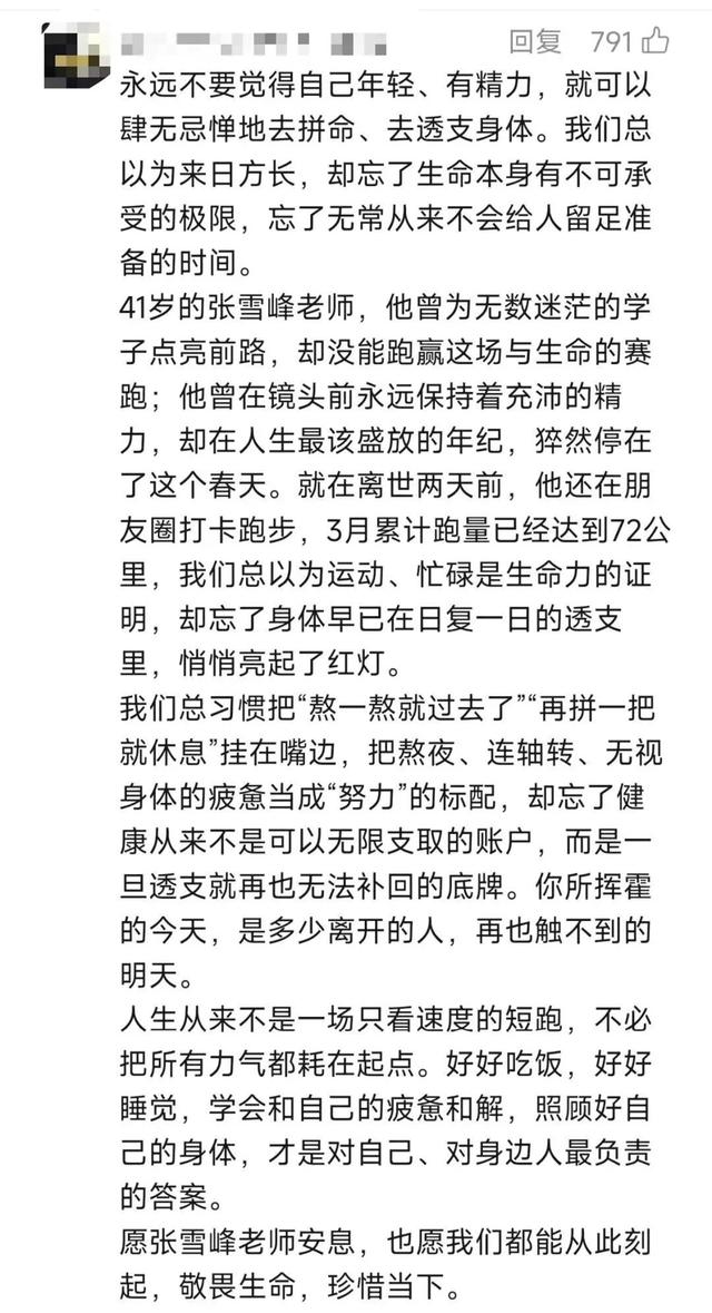 据报道,就在事发两天前,张雪峰还在社交平台打卡跑步记录,其3月22日完成7公里跑步,当月累计跑步里程已达72公里。公开资料显示,张雪峰常年高强度工作,2023年6月曾因过度劳累引发胸闷心悸被强制住院。