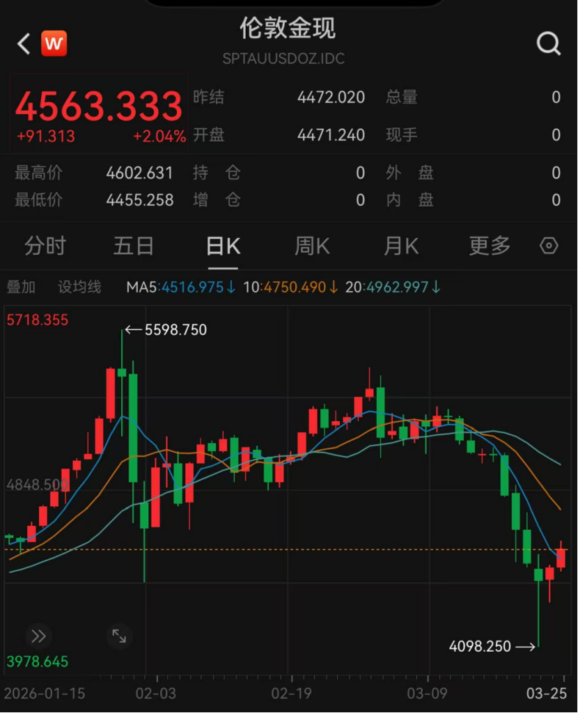 伦敦现货黄金在2026年3月17日触及年内高点5017.6美元/盎司后,截至3月23日最低下探至4219.33美元/盎司,累计跌近800美元,跌幅超15%,国内黄金T+D也同步重挫,单日跌幅达11.45%,跌破920元/克整数关口,金价在短时间内抹去2026年以来的全部涨幅。