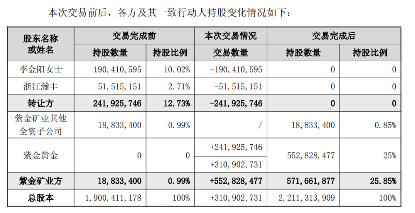 记者注意到,本次交易对价合计约182.58亿元,交易完成后紫金黄金将持有赤峰黄金增发后总股份数的25.85%,实现对赤峰黄金的财务并表,李金阳及浙江瀚丰则将彻底退出赤峰黄金持股。