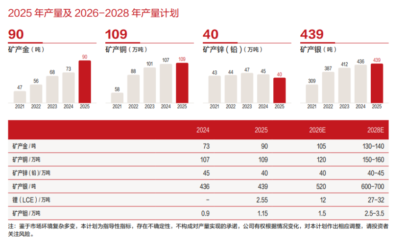 2025年公司归母净利润的大幅增长,核心得益于矿产品的量价齐升。产量方面,公司全年实现矿产金90吨,同比增长23%,增速位居全球矿企前列,且超额完成85吨的年度产量目标;矿产铜约109万吨,在高基数上保持稳健增长;矿产银约437吨,当量碳酸锂约2.5万吨,较2024年的261吨实现跨越式增长。价格方面,2025年公司矿产金、铜销售价格分别同比增长49.4%和11.8%至778元/克和6.5万元/吨,产品价格的上涨成为盈利增长的重要驱动力。