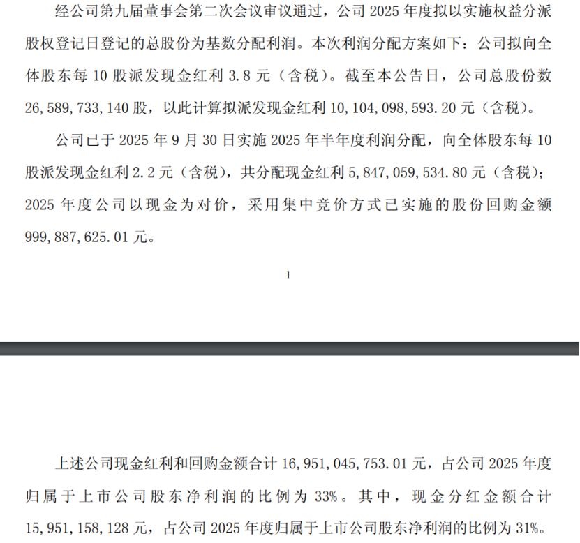 分红方面,公司拟向全体股东每10股派发现金红利3.8元(含税),拟派发现金红利合计101.04亿元(含税),叠加此前已完成的2025年中期分红58.5亿元,公司2025年全年分红规模将达159.5亿元,现金分红金额占2025年度归母净利润的比例为31%。同时公司还提请股东会授权董事会制定2026年中期利润分配方案,拟向全体股东每10股派发现金红利不少于3.8元(含税)。