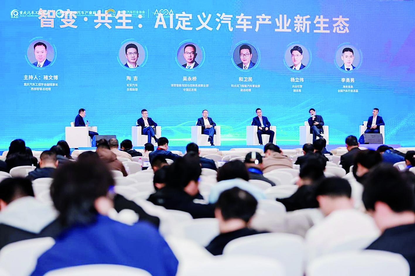 3月24日,重庆两江新区,重庆汽车行业第37届年会举行“高端对话”环节。长安汽车、博世、科大讯飞、火山引擎、海光信息、西部智联等企业负责人围绕“AI定义汽车产业新生态”展开探讨。
