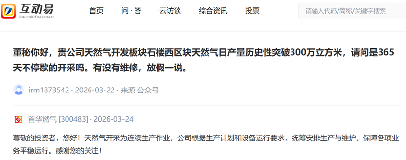 特别是针对投资者关注的石楼西区块天然气日产量的提问,公司在深交所互动易回复称,天然气开采为连续生产作业,公司根据生产计划和设备运行要求,统筹安排生产与维护,保障各项业务平稳运行。
