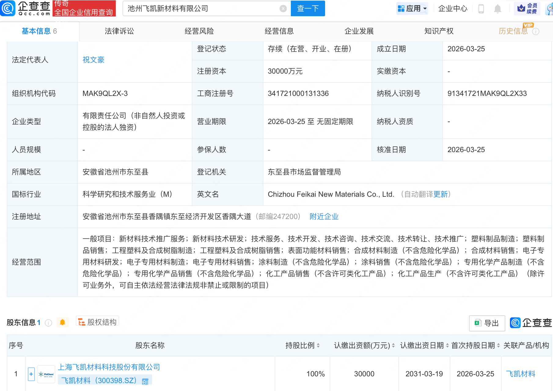 企查查APP显示,近日,池州飞凯新材料有限公司成立,注册资本3亿元,经营范围包含:电子专用材料研发;电子专用材料制造;电子专用材料销售;涂料制造(不含危险化学品)等。企查查股权穿透显示,该公司由飞凯材料(300398.SZ)全资持股。
