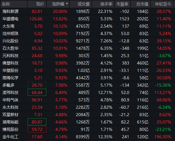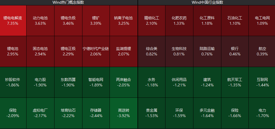 从板块看,化工板块持续走高,锂电概念股集体走强,而电力、贵金属、多元金融等板块跌幅居前。