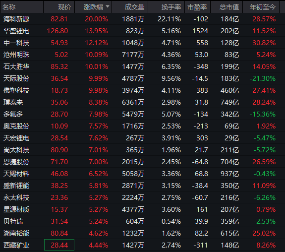 锂电概念股集体走强,锂矿、电解液、固态电池等方向表现活跃,海科新源实现20%涨停,融捷股份实现3连板,沧州明珠、石大胜华、天际股份(维权)等多股涨停。