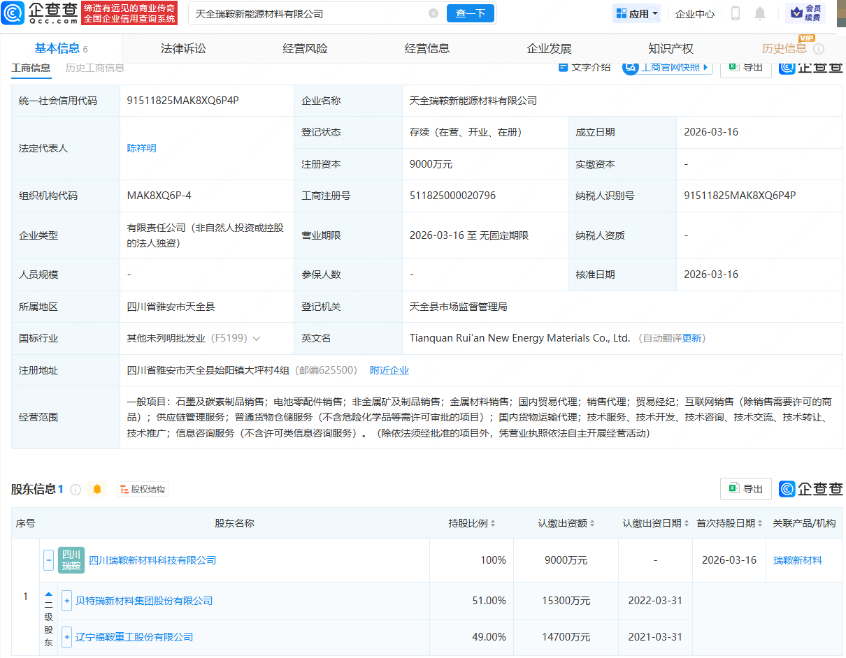 企查查APP显示,近日,天全瑞鞍新能源材料有限公司成立,法定代表人为陈祥明,注册资本为9000万元,经营范围包含:石墨及碳素制品销售;电池零配件销售;非金属矿及制品销售;金属材料销售;贸易经纪等。企查查股权穿透显示,该公司由四川瑞鞍新材料科技有限公司全资持股,后者由贝特瑞(920185.BJ)、福鞍股份(603315.SH)共同持股。