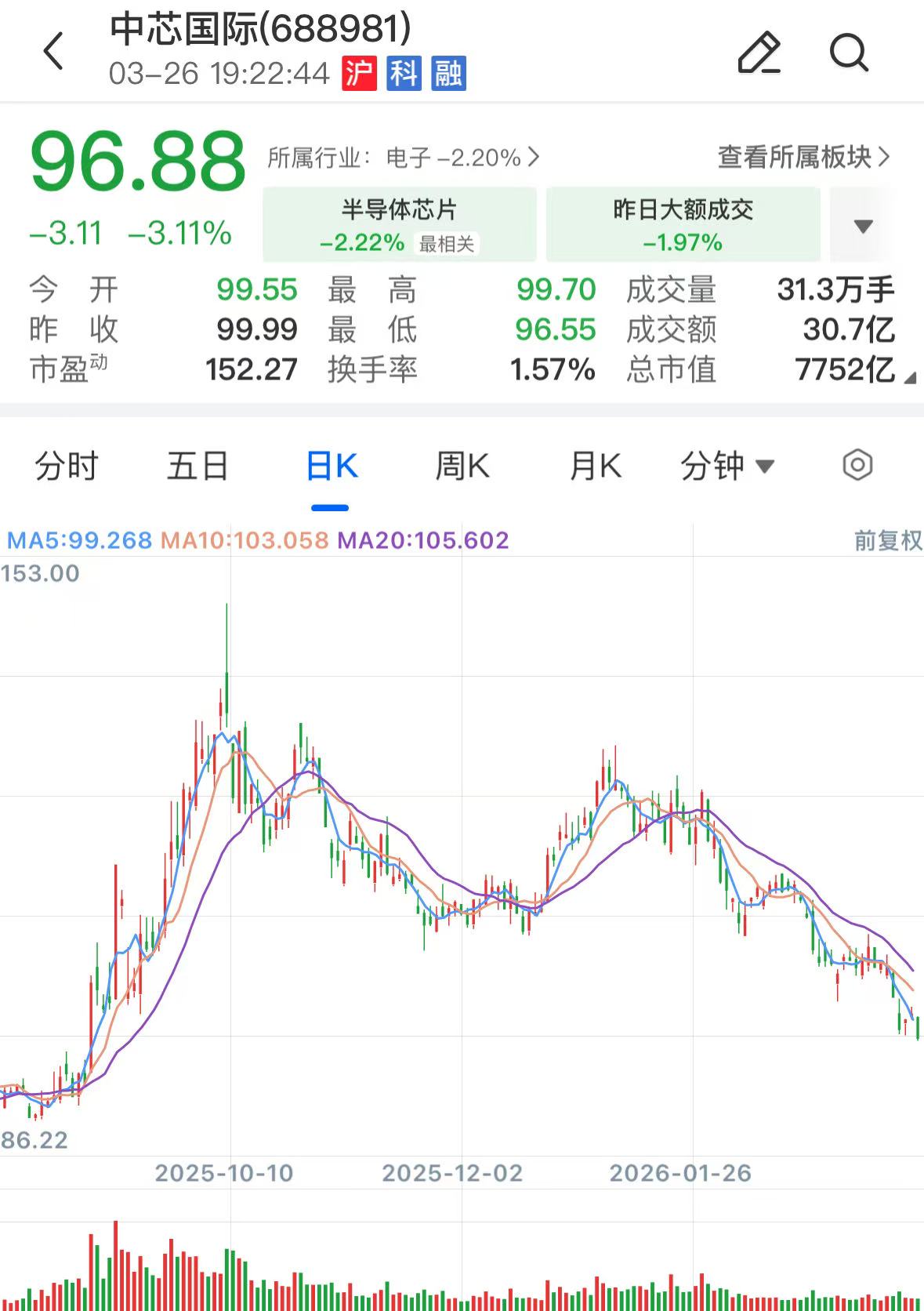 从二级市场表现看,近期中芯国际A股股价出现震荡调整,自2025年10月以来,该股股价从最高153元回落至今,累计下跌幅度超30%,截至目前,中芯国际A股报收96.88元/股,总市值达7752亿元。