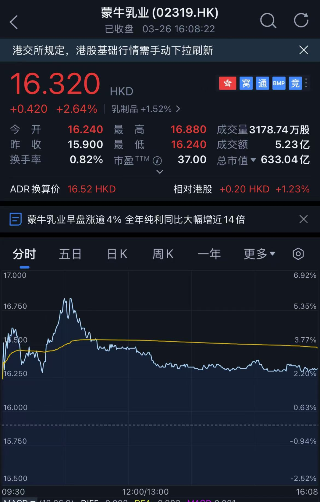 受业绩利好带动,蒙牛股价26日逆势上涨,收报16.32港元/股,涨幅2.64%,盘中一度涨超6%。花旗表示,预计蒙牛2026年销售额恢复至低个位数至中个位数增长,利润率重新扩张,维持对蒙牛的“买入”评级。