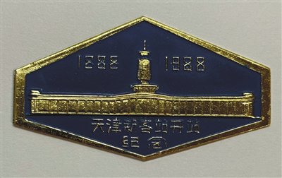 1988年10月,在天津站建成100周年之际,天津铁路枢纽改造工程竣工通车。有关部门发行了一套圆形纪念大铜章,画面以建有时钟塔楼的天津站主站房为主图,另外还制作了相关内容的金属章牌,颇受收藏爱好者珍爱。