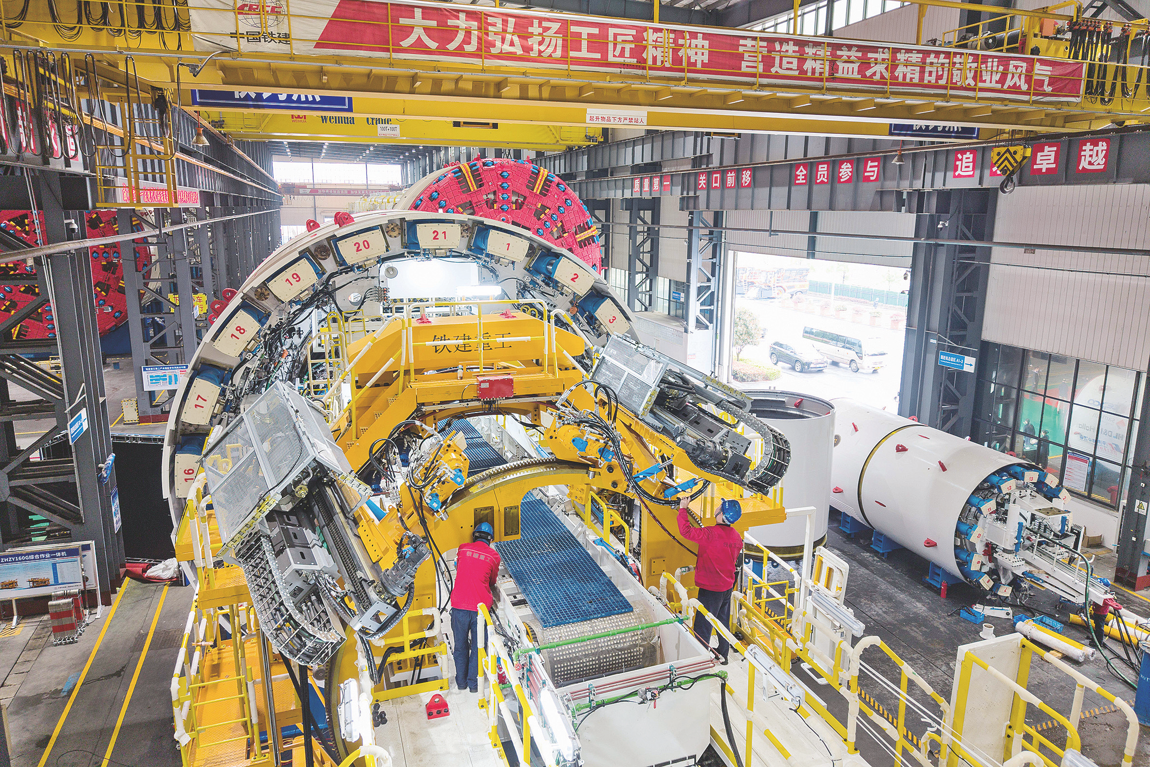 3月26日,在铁建重工长沙第二产业园,技术人员在检查出口意大利铁路项目的掘进机(无人机照片)。