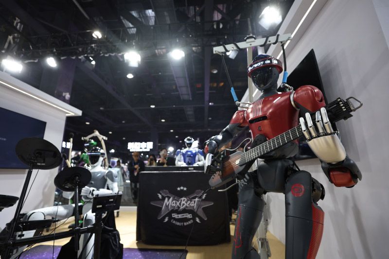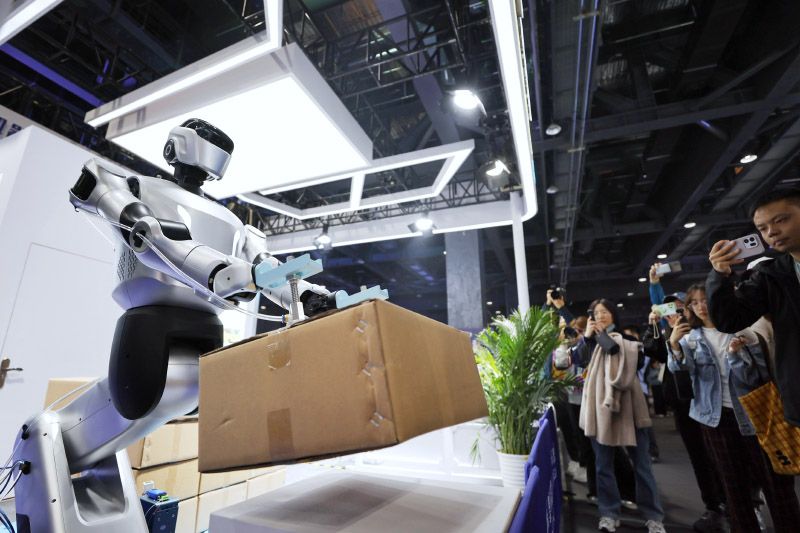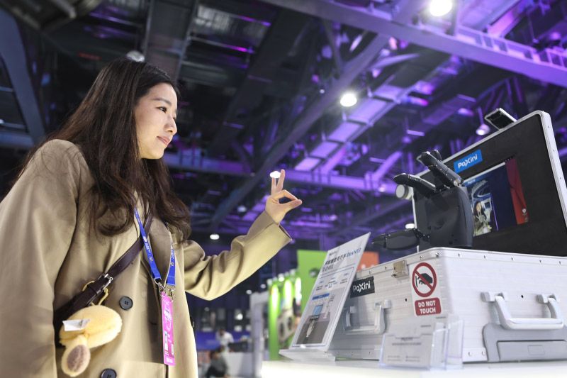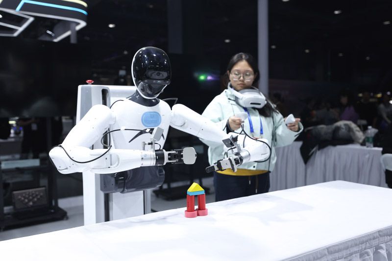 工作人员与人形机器人互动。>>>查看更多:股市要闻