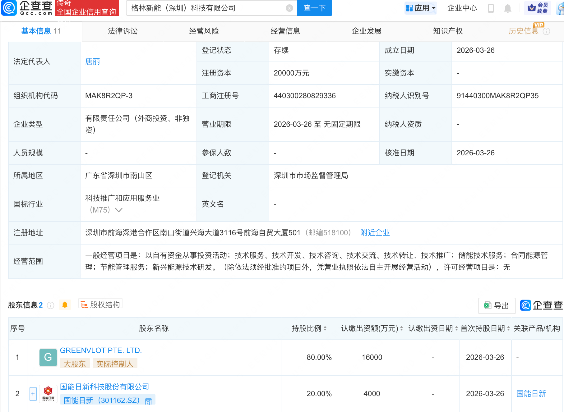 企查查APP显示,近日,格林新能(深圳)科技有限公司成立,注册资本2亿元,经营范围包含:储能技术服务;合同能源管理;节能管理服务;新兴能源技术研发等。企查查股权穿透显示,该公司由国能日新(301162.SZ)等共同持股。