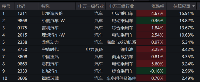 【港股通汽车ETF汇添富(159210)标的指数前十大成分股】
