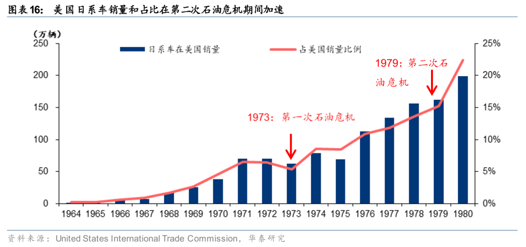 华泰证券回顾上世纪70年代,两次石油危机(1973年与1979年) 作为关键的外部冲击,构成了日本汽车产业在全球崛起的最重要催化剂。石油危机前,以美国为代表的西方市场长期偏好大排量、大尺寸、动力强劲的车型,但油价急剧上行显著提高了用车成本,使高油耗车型需求迅速收缩,整体汽车消费也受到冲击。根据美国国际贸易委员会,1974年美国汽车表观消费量下降约20%,1979年和1980年分别下降了8%和16%。日本车企长期形成的小型化、轻量化与低油耗技术路径开始体现出显著竞争优势。尽管早期出口美国的车型(如皇冠、达特桑)曾因不符合当地消费者对“大而强”的偏好而销量有限,但在油价冲击下,这一原本的劣势迅速转化为优势。在1974年美国整体汽车销量下滑约20%的背景下,日系车在美销量达到约80万辆,逆势同比增长27%,其市场份额也从1970年的不足5%迅速提升至1980年超过22%。日系车渗透率提升斜率最陡峭的阶段均发生在两次石油危机期间,1974年和1980年美国日系车销量渗透率同比分别增长3、7个百分点。