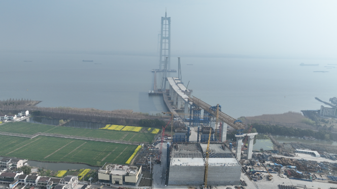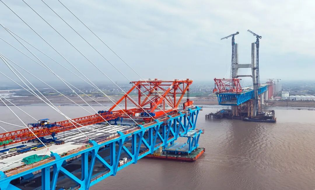 截至3月25日,北沿江(沪渝蓉)高铁控制性节点工程——崇启公铁长江大桥工程总进度已达86%,斜拉索挂设、桥板钢筋焊接等施工作业有序推进。全线1000余名建设者奋战在关键点位,全力冲刺4月初主桥第五节钢梁吊装节点。