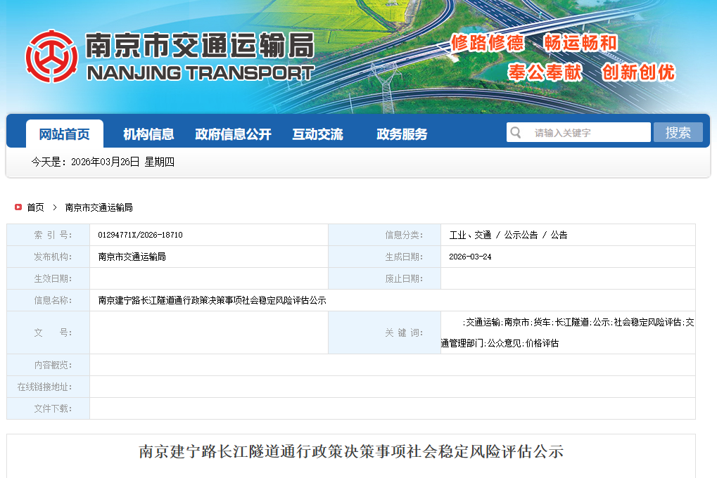 3月24日,南京交通运输局发布了《南京建宁路长江隧道通行政策决策事项社会稳定风险评估公示》,就拟定的通行政策向社会各界征意见和建议,公示时间为2026年3月24日至2026年4月7日。