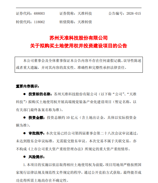 3月27日,天准科技(688003.SH)公告称,公司拟以约10亿元(含土地出让金)投资建设高端视觉装备产业化建设项目,项目位于苏州市虎丘区科技城,占地面积约92亩,规划建筑面积约14.6万平方米,建设周期24个月,预计2026年9月开工。资金来源为自有或自筹资金,项目尚需通过公开竞拍取得土地使用权并完成相关审批手续。该事项已经董事会审议通过,无需提交股东大会审议,不构成关联交易或重大资产重组。