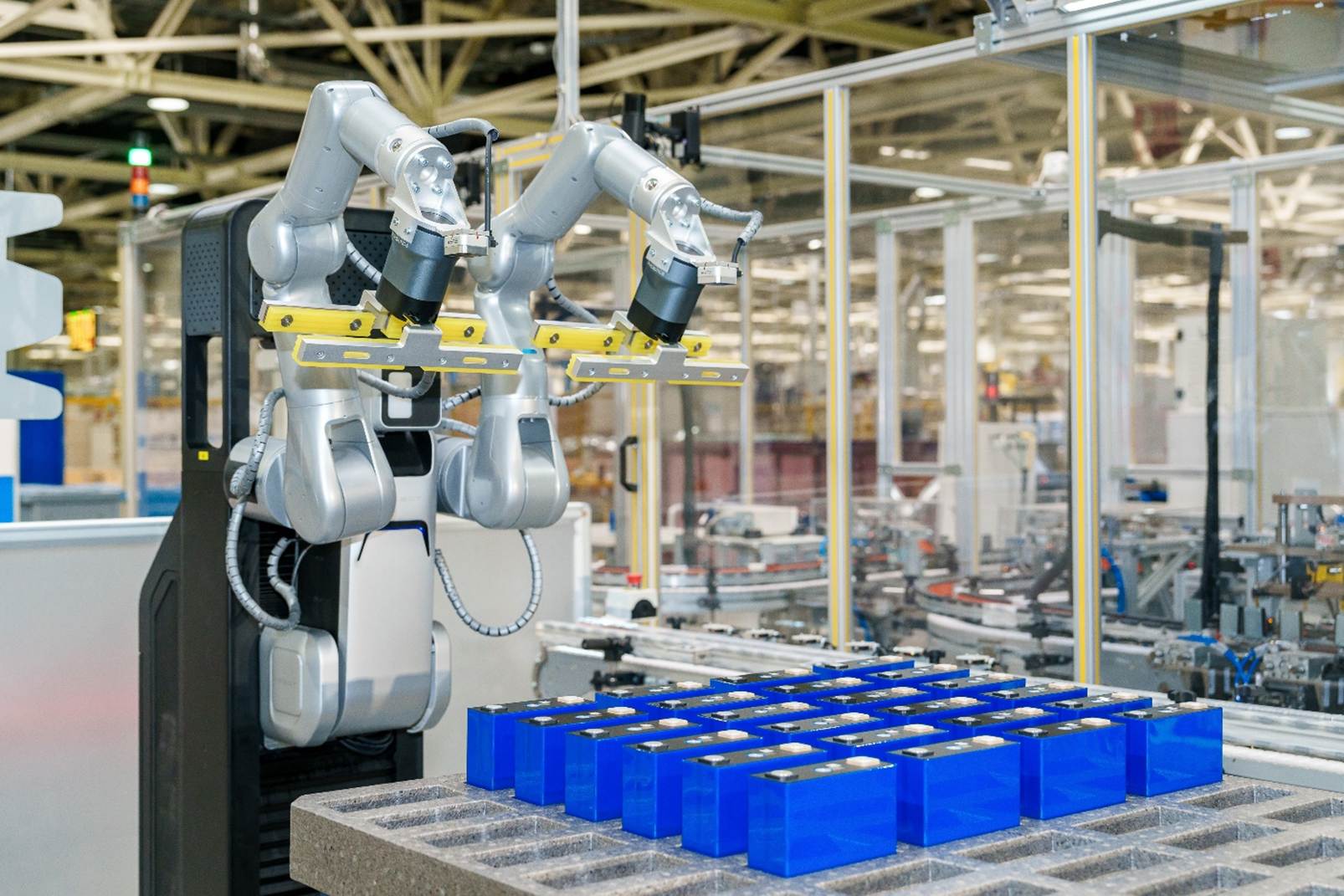 在电池包制造环节,传统人工上料存在带电操作风险与技能门槛,传统工业机器人也面临占地大、柔性不足等局限。“能仔1号”具备视觉感知、双臂协同、力控抓取等拟人特性,可自主完成电芯来料识别、抓取路径智能规划,无需依赖固定编程与来料的精确定位。其±0.1毫米的导航引导轨迹累计定位精度、约2秒/件的作业效率,以及不足传统自动工位15%的占地面积,全面匹配量产线节拍要求与安全标准。