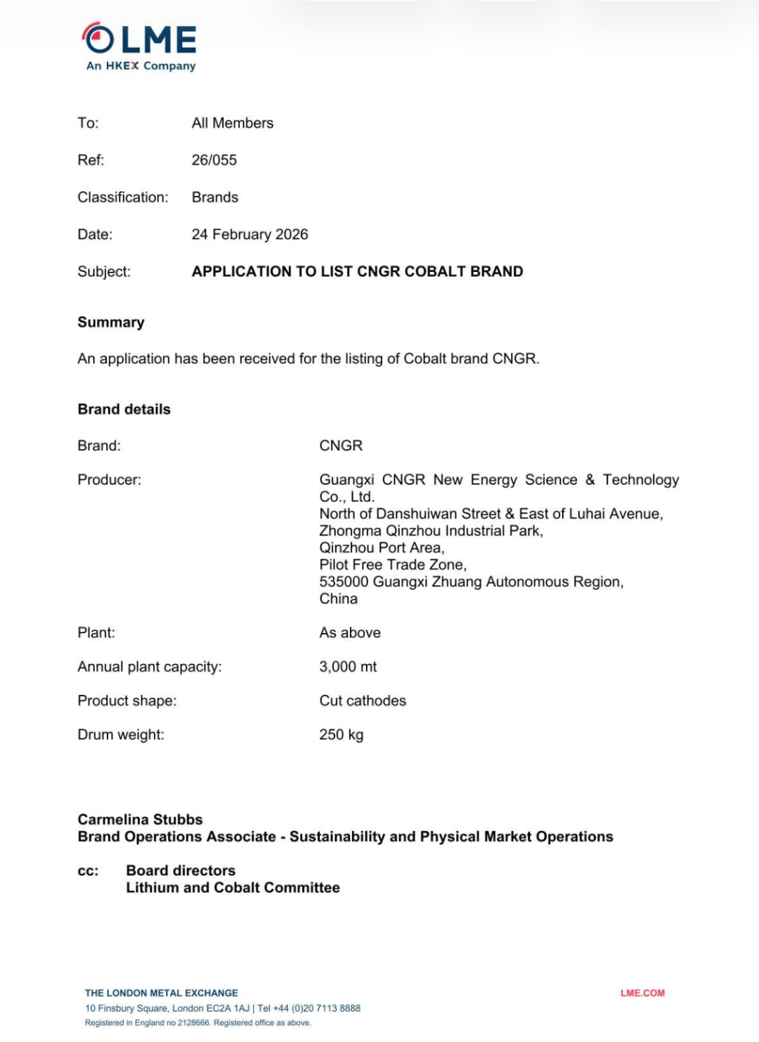 中伟新材“CNGR”牌电解钴成功注册为LME交割品牌