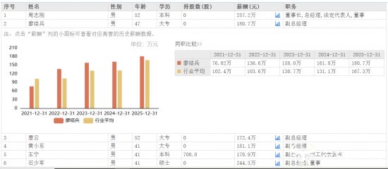 此外,副总经理石少军薪酬由277.8万元下调了33.5万元至244.3万元,而副总经理王永强2025年薪酬略降1.2万元至208.5万元。上述三人虽薪酬均有所下降,但仍是超过了200万元,均高于廖结兵。