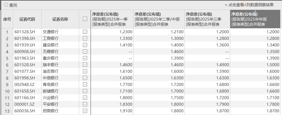 3月28日,财联社记者根据东方财富Choice数据统计,截止目前,13家上市银行披露2025年年报,剔除未披露三季度净息差数据的两家银行,有6家上市银行四季度末的净息差较上一季度持平或有回升。